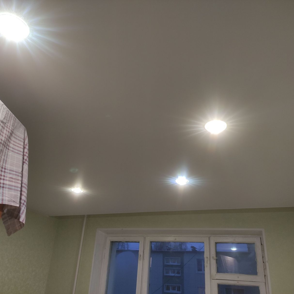 Глянцевый натяжной потолок с люстрой и светильниками в Клину